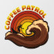 Kaffeepatrol. Surfen Sie mit einer Tasse Kaffee und reiten Sie eine Kaffeewelle mit einem Sonnenuntergang im Hintergrund. Retro 70er bedrückte Stil.