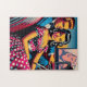Das im Stil der 50er Jahre erbaute Paar auf einem romantischen Datum in seinem Cabrio-Auto in einem Kino mit Antrieb. Niedliches Comic Buch Stil Cartoon Pop Kunst ai.