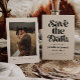 Retro und elegante Save the Date-Karte mit bohem Schriftart, der auf einem cremefarbenen Hintergrund "Save the Date" weiß steht. Sie können ein Foto auf der Rückseite hinzufügen.