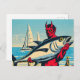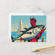 Retro Devil mit einem Tunfisch am Strand Postkarte