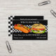 Funky, fun und Retro Diner Business Card mit Hot Dog und Hamburger vorne auf einem schwarz-weißen Schachbrett. Hintergrund ist schwarz. ©2010 Schokolade Designs | E. Thompson WIRD VON IHNEN TOTAL ANGEBOTEN!