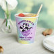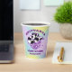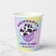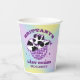 Girly Girl lila Glitzer Disco-Ball und ein sehr Retro Kuh-Muster cowgirl, das zusammen die perfekte Disco Cowgirl Papier-Tasse kreiert. Ein holografischer lila, blauer und gelber Aquarellhintergrund rahmen ihn. Dieser Artikel ist Teil der Lila Glitzer- und Kuh-Muster-Kollektion, wo Sie viele Junggeselinnen-Abschied-Schreibwaren und Party-Vorräte finden.