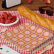 Retro Dot Grid Pink und Orange Muster. Spaß Vintages ästhetisches geometrisches Design mit einem Mod 60er 70er aus der Mitte des Jahrhunderts. Von Kierkegaard Design Studio.