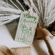 If you are looking for a unique and beautiful easily editable Christmas gift tag. This One is perfect for you. As you see the design features a unique green hand made and drawn Santa Clause sitting on a champagne glass. With green hand written typography of merry Christmas and handwritten family name in green. All on watercolor stripes.