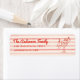As you see the design features a unique red hand made and drawn Santa Claus sitting on a champagne glass. With red hand written typography of your family name. And your handwritten red return address. That is easily customizable.