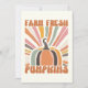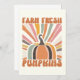 Dieses lebhafte und inspirierte Herbstdesign hebt den Begriff "Farm Fresh Pumpkins" in fett gedruckter, spielerischer Typografie hervor, die sofort Aufmerksamkeit erregt. Im Mittelpunkt des Designs steht ein großer, stylisierter Kürbis, der in warmen Orange-, Braun- und Cremetönen dargestellt ist. Der Kürbis wird von einem farbenfrohen Lichtstrahl gerahmt, der sich nach außen hin ausdehnt und eine Palette von gedämpften Orangen, Rosa, Gelb und Grüntönen umfasst, die dem Design ein nostalgisches, Vintages Gefühl verleihen. Die Kombination aus Sonnenburstmuster und dem grobkörnigen, kurvigen Schriftart verleiht dem Kunstwerk ein unterhaltsames und kraftvolles Ambiente, das perfekt zum Festhalten am Herbst geeignet ist.