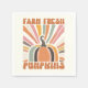 Dieses lebhafte und inspirierte Herbstdesign hebt den Begriff "Farm Fresh Pumpkins" in fett gedruckter, spielerischer Typografie hervor, die sofort Aufmerksamkeit erregt. Im Mittelpunkt des Designs steht ein großer, stylisierter Kürbis, der in warmen Orange-, Braun- und Cremetönen dargestellt ist. Der Kürbis wird von einem farbenfrohen Lichtstrahl gerahmt, der sich nach außen hin ausdehnt und eine Palette von gedämpften Orangen, Rosa, Gelb und Grüntönen umfasst, die dem Design ein nostalgisches, Vintages Gefühl verleihen. Die Kombination aus Sonnenburstmuster und dem grobkörnigen, kurvigen Schriftart verleiht dem Kunstwerk ein unterhaltsames und kraftvolles Ambiente, das perfekt zum Festhalten am Herbst geeignet ist.