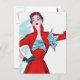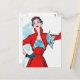 Aus einer Vintagen Modepublikation. Das Modell zeigt ein rotes Kleid mit blau-weiß gestreiften Leisten.