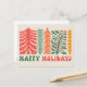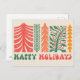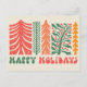 Diese lebendige Ferienkarte umarmt ein Retro-Design mit einer Reihe stilisierter Bäume in Rot, Orange und Grün, jedes mit seinem einzigartigen, dekorativen Muster. Die Bäume sind mit Sternen, Beeren und festlichen Ästen geschmückt, was ein Gefühl von Feiertagsstimmung und Launen hervorruft. Die Worte "Happy Holidays" werden in fett-spielerischem Schriftart am unteren Ende angezeigt und fügen diesem reizvollen Design eine nostalgische Touch hinzu. Ideal, um während der Festsaison mit einem Vintagen Flair fröhliche Grüße zu versenden.