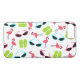 Ein iPhone 6 Fall, der ein Muster besteht aus rosa Flamingos kennzeichnet, Grün drehen Reinfälle und retro blaue Katzenaugensonnenbrillen um.
