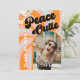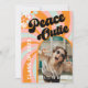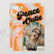 Fun Retro Hippie Vibes Foto Graduierungsparty Einladung! Wirble Sonnenburstlinien in sanftem Rosa, Pastellblau und Orange mit frischen Blume und den Worten "Peace Outie" in Retroschrift. Fügen Sie das Foto Ihres Absolventen auf der Vorderseite und Abschlussfeier Informationen auf der Rückseite.