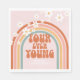 Retro inspiriert Vier-Ever-Jung 4. Geburtstag Party-Servietten mit Hippie-Stil Regenbogen, Gänsebläschen und boho Schriftart und Farben.