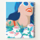 Retrofrau mit Blume und Sonnenschein und Sonnenbrille, hellroter Lippenstift und dunklem Haar. Was für eine sonnige, helle und farbenfrohe Strandszene auf einer spiralgebundenen Zeitschrift.