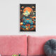 Eine lebendige Leinwand, die futuristische Städte mit Retro-Gaming-Nostalgie verbindet. Dieses Kunstwerk besticht durch kühnen Blau-, Orange- und Goldtönen und unterstreicht einen klassischen Spielcontroller, der von Konsolen und Blume umgeben ist und die Harmonie zwischen Technologie und Kreativität symbolisiert.