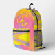 Mit diesem Retro-Design in leuchtenden Farben behalte man sich in einer Menschenmenge. Die Vorderseite ist ein solideres Design in Blues, Pinks, Orangen und Gelb und hat ein koordinierendes, aber kontrastierendes Friedenssymbol an der Spitze. Die Gelbmenge wurde auf dem Beutel, den Seiten und den Spitzen erhöht, wobei die Wirbel einen ernsthaften Kontrast zum Gesamtdesign bilden.