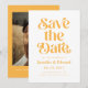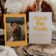Retro und elegante Save the Date Karte mit boho Schriftart, der "Save the Date" in gelber Farbe sagt. Sie können ein Foto auf der Rückseite hinzufügen.
