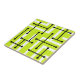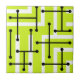 A simple mid century modern pattern with geometric shapes resembling a maze, with lines of various sizes. Bright yellow-green with black lines.