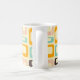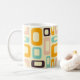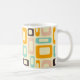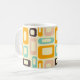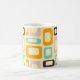 Retro geometric pattern with overlapping rectangles and ovals in orange, teal, pink, and brown on a light beige background, creating a playful, vibrant mood.