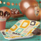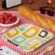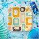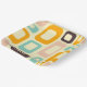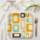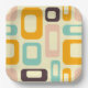 Retro geometric pattern with overlapping rectangles and ovals in orange, teal, pink, and brown on a light beige background, creating a playful, vibrant mood.