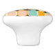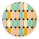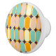 Retro geometric pattern with overlapping vertical ovals in shades of teal, peach, orange, and cream on a dark brown background. Vibrant and symmetrical.