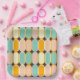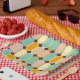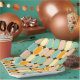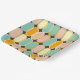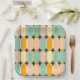 Retro geometric pattern with overlapping vertical ovals in shades of teal, peach, orange, and cream on a dark brown background. Vibrant and symmetrical.