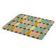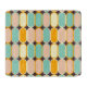 Retro geometric pattern with overlapping vertical ovals in shades of teal, peach, orange, and cream on a dark brown background. Vibrant and symmetrical.