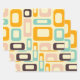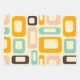 Retro-geometrisches Muster mit überlappenden Rechtecken und Ovalen in Orange, Türkis, Pink und Braun auf hellbeigem Hintergrund, das eine spielerische, lebendige Stimmung erzeugt.