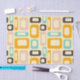 Retro-geometrisches Muster mit überlappenden Rechtecken und Ovalen in Orange, Türkis, Pink und Braun auf hellbeigem Hintergrund, das eine spielerische, lebendige Stimmung erzeugt.