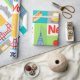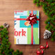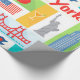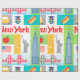 Retro Geschenk-Packpapier New York City. Helles werden in retro Primärfarben diese iconic Symbole von New York wie der Apfel, alle in Brücke, in den gelben Taxifahrerhäusern und in den Gebäude in dieser New- York Cityikonengeschenkverpackung gekennzeichnet. Vervollkommnen Sie für Theater, kommerzielles Geschäft oder persönliche Geschenke mit einem glatten, mutigen und künstlerischen Blick der Stadt.