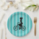 Eine niedliche Retro-Grafik. Eine Silhouette einer Frau in einem Pferdeschwanz, Kleid tragen und Fahrrad fahren. Der Hintergrund ist ein türkisblau gestreiftes Muster mit abwechselnden hellen und dunklen Tönen.