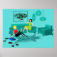 Es sieht so aus, als würde es eine lustige Zeit mit dieser kitschigen Retro Girls’ Night In Poster werden. Das minimalistische Design der 60er Jahre besticht durch zwei Frauen mit rosa Cocktails in einem modernen, türkisfarbenen und aqua-aquatischen Wohnzimmer. Diese Damen wissen bestimmt, wie man sich entspannt. Die ravenhaarige Schönheit in dem koketten, grünen Kleid liegt auf dem atomaren Sofa. Ihre blonde Begleiterin sitzt auf einem Zebra-Druckteppich und trägt eine rote und enge, schwarze Hose. Der Vintage Schallplattenspieler und die Lampenleuchten aus Papier geben Set. Über dem Mod-Sofa hängt ein gerahmter, weltraumhafter Kunstdruck.