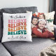 Erstellen Sie dauerhafte Erinnerungen, indem Sie dieses Retro-Kissen mit einem Ihrer Lieblingsfamilien-Fotos in den Retrofarben "Wir glauben an den Weihnachtsmann" ergänzen.
