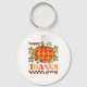 Retro Groovy Stil bunt Erntedank Schlüsselanhänger. Elegante Retro-Schriftart-Typografie "Happy Thanksgiving", mit niedlichen, dunklen Blume, Sternen und einem Kürbis.