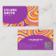 Eine Vintage Retro Psychedelic farbige flüssige Visitenkarte. Das ist ein handgefertigtes, groovierendes Muster mit abstrakten, wellenförmigen Formen. In elegantem lila und pink, gelb und orange. Moderne und dennoch nostalgische 70er Jahre mit Farben und frommen Schriftart. Mit individualisierbarem Namen und Beruf und QR-Code.