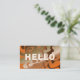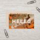 Hallo in einem kühnen Schriftart in Creme, auf einem asymmetrischen abstrakten Design in Retro-Orange und Braun, mit einem metallischen Effekt aus der Gradientenkunst.