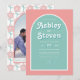 Dieses Foto Hochzeit Einladung wird vom 70er inspiriert, mit Retro-Groovy rosa-pfirsich und Perlen Aqua-Farben zeigen. Der Retrostil mit einer Touch von 70er-Jahren-Villen in sanften Pastellfarben. Die Vorderseite der Einladung zeigt ein Bogen-Design mit Ihrem personalisierten Text, während die Rückseite mit einem Retro-Blume-Muster und einem Foto des Paares ausgestattet ist.