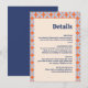 Treten Sie mit unserer Mod Elegance Hochzeitszitkarte in eine Zeitkapsel der schicken Nostalgie ein. Diese Karte wurde entworfen, um Sie in die glamourösen 1960er Jahre zu führen und ist eine harmonische Mischung aus Vintager Eleganz und zeitgenössischem Stil. Die Vorderseite der Karte zeichnet sich durch ein klassisches Muster aus, das kühne und kontrastreiche Farben aufweist, die die Bühne für ein Fest im Gegensatz zu jedem anderen Set verleihen. Fügen Sie Ihre persönlichen Daten hinzu, indem Sie auf die Option "Personalisieren" klicken.