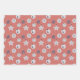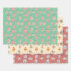 A pretty trio of holiday wrapping paper sheets featuring retro Christmas ornament patterns on pink, tan, sea foam green backgrounds.