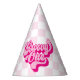 Erstellen Sie Ihre eigene Retro-Stil heiß rosa und rosa "Groovy One" Typografie Papier Party Hut für den ersten Geburtstag Ihrer Tochter. Sie können alle Farben sowohl im Text als auch in den überprüften Vektorgrafiken ändern. Passen Sie den Text aus dem System an, um Ihr eigenes personalisiertes Design zu erstellen. Weißes und pastellrosa Schachbrettmuster.