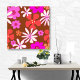 Retro flowers wall art in vintage colors. Large design that makes a statement. Bright orange and shades of pink with white over a brown background. Largest size is 40 inches square, or downsize. Transfer the design to other media if you prefer.