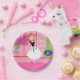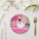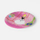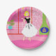 Dieses Retro In the Pink Paper Plate sieht aus wie eine Szene aus einer romantischen Comedy aus den 1960er Jahren. Das minimalistische Design zeigt eine raffinierte Frau in ihrem ultra kitschigen und ultra rosa Penthouse Apartment. Der Saal ist mit einer rosa Ziegelwand mit weißen Kacheln versehen. Vor der Wand befindet sich ein grüner Kamin mit Kamin und einem rauschenden Feuer. Durch Glasschiebetüren sehen wir einen rosa Balkon mit weißem Geländer. Eine üppige, tropische Pflanze befindet sich in einem Aqua-Blumentopf. Vom Balkon aus hat man einen Blick auf die Silhouette einer großen Skyline der Stadt. Natürlich ist die Silhouette in Rosatönen gehalten! Ein gelber, halbmondlicher Mond ist am Himmel. Stehend auf einem heißen rosa Teppich in der Wohnung ist die führende Dame dieses Designs. Im krassen Gegensatz zur rosigen Welt, die sie geschaffen hat, trägt die schöne Blondine ein schwarzes, schwarzes, spitzenhaltiges Oberteil mit einem langen, flachen, weißen Rock mit schwarzen Federdekorationen. Mit diesem Design können auch Sie durch die Rose-Brille die Welt betrachten!