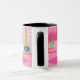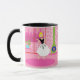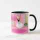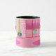 Dieses, das in der rosa Wecker-Tasse Retro ist, sieht wie eine Szene aus einer Sechzigerjahre romantischen Komödie heraus aus. Der unbedeutende Entwurf zeigt eine hoch entwickelte Frau in ihrem ultra kitschy und ultra rosa, Penthauswohnung. Der Raum kennzeichnet eine rosa Backsteinmauer mit weißen Bewurflinien. Vor der Wand gibt es einen grünen Kegelkamin mit einem Brüllenfeuer. Durch Glasschiebetüren sehen wir einen rosa Balkon mit einem weißen Geländer. Eine üppige, tropische Pflanze ist in einem Aqua Flowerpot. Die Ansicht vom Balkon ist von einer Silhouette eines großen Stadt Skyline. Selbstverständlich ist die Silhouette in den Schatten des Rosas! Ein Gelb, sichelförmiger Mond ist im Himmel. Auf einem heißen Rosa, Noppewolldecke in der Wohnung ist die führende Dame dieses Entwurfs stehend. In starkem Kontrast zur rosigen Welt, die sie, die schöne Blondine hergestellt hat, trägt eine Forminstallation, Schwarzes, Schaufel-necked Spitze mit einem langen, erweiterten, weißen Rock mit schwarzen Federverschönerungen. Mit diesem Entwurf können Sie die Welt auch betrachten durch Rose farbige Gläser!