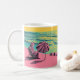 Ein fabelhafter Retro-inspiriert Druck auf einer Tasse Der Ausdruck ist KI generiert und ist einzigartig in Brighton Prints Das Bild zeigt eine Strandszene, mit dem Meer und Sand, Schirme und Menschen haben eine großartige Zeit. Das Bild hat einen ziemlich großen Pop-Art-Look und würde in jeder Küche oder Tasse-Kollektion gut aussehen.