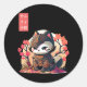 Retro Kawaii Samurai Katze mit Cherry Blossom Tree Runder Aufkleber