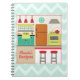 Ein gewundenes Rezeptnotizbuch, das eine Illustration einer retro inspirierten Küche mit einem Rot, einem Türkis, einem Gelb und orange einem Farbentwurf kennzeichnet. Hintergrund ist blauer Zickzack. Personifizieren Sie mit Ihrem Namen.