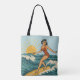 Diese sonnige Surf-Tasche ist die perfekte Strandtasche und eine großartige Möglichkeit, Ihre täglichen Essentials zu transportieren. Die retro-inspirierte Kunst zeigt ein Surf-Pin-Up-Modell, das auf einer endlosen Welle unter blauem Himmel und strahlender Sonne reitet. Entworfen mit altmodischer kalifornischer Energie, gibt der abgenutzte Look ihr ein authentisches Gefühl, als ob sie direkt aus einem Vintage-Surfshop gezogen wurde. Zeigen Sie Ihre Liebe zu den Wellen mit dieser lustigen Tasche.