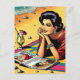 Retro Pop-Art-Frau in einem Stil der 1950er Jahre Mitte Jahrhundert trinken einen Cocktail und Tag träumen davon, Mode lesen eine Zeitschrift am Strand.