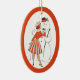 Beide Seiten dieses Holiday-Ornaments haben ein wunderbares Retro-Bild einer Frau aus der 50er Jahre, die in einem roten Pullover, gestreiften Rock und rosa Hut gekleidet ist. Sie hat angehalten, um die Krawatte eines schwarzen Bogens auf einem lächelnden Schneemann zu korrigieren. Der Schneemann trägt einen schwarzen und roten Top-Hut. Das Bild ist in einem passenden roten ovalen Rahmen gerahmt. Es macht Spaß, Weihnachten auf die altmodische Art zu feiern!
