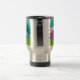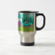 Diese Retro Lagerbewohner-/Anhänger-und Auto-Reise-Tasse kennzeichnet eine moderne Mitte des Jahrhunderts, unbedeutendes Cartoonzeichnen, das Sie verlässt vorzubereiten, um zur offenen Straße zu nehmen. Eine Ehrerbietung zu den fünfziger Jahren, dieses Ausrüstungsbeschreibungen ein Vintages Türkisauto mit der weißen Spitze, einen kitschy Reiseanhänger zu seinem abschließenden Bestimmungsort ziehend. Der tadellos wieder hergestellte, Retro RV hat eine Pink, weiße Spitzenhälfte der unteren hälfte und einen Türkisblitzbolzen, der die zwei trennt. Die Tür in der Seite des Campers ist auch Türkis. Der abschließende Akzent ist der Flügel des heißen Rosas, der von der Rückseite dieses Zuhause auf Rädern hervorsteht. Die glücklichen Menschen fahren hinunter eine graue Straße. Die Fahrbahn wird durch Stoff, grünes Gras umgeben. Im Hintergrund können wir die aquamarinen Silhouetten eines wirklichen Waldes der Zedernbäume, gegen einen Aquahimmel mit den geschwollenen, hellblauen Wolken sehen. Dieser Entwurf ist für jeder von pensioniertem Hippies, von Vogel-Hipstern oder von jedermann perfekt, der will, um einige große Kindheits-Erinnerungen wieder zu erleben. Das beste Teil ist, dass niemand fragt, "sind wir dort schon?"