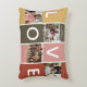 Erstellen Sie mit dieser trendigen Vorlage Ihr eigenes Foto-Collage-Kissen. Das Design enthält das Wort LIEBE, 4 hintere Streifen mit quadratischen Bildern, Familienname, Datum und aussagekräftige Wörter.